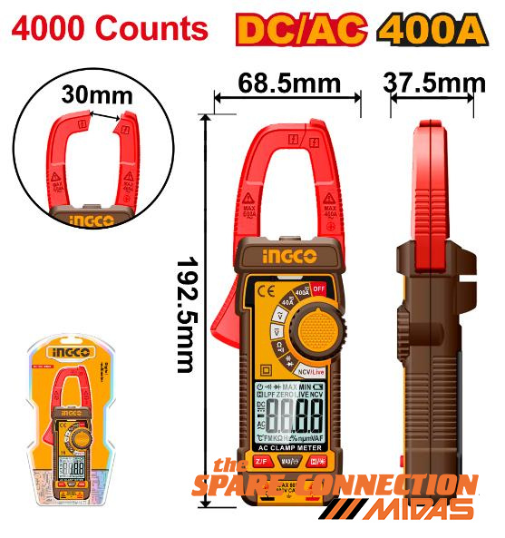 DCM62002 Clamp Meter 400A AC/DC True RMS · Display: TRUR RMS 4 000 counts · DC/AC Current: 4A/40A/400A · DC/AC Voltage: 400mV/4V/40V/600V · Resistance: 400Ω/4kΩ