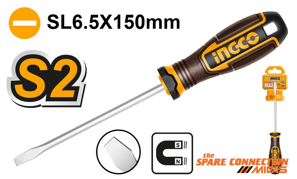 Blade material: S2Tip type: slotted SL6 (magnetic)Tip size: 6.5 mmBlade length: 150 mmBlade diameter: 6.0 mmShank type: roundHandle material: three-colour ergonomic