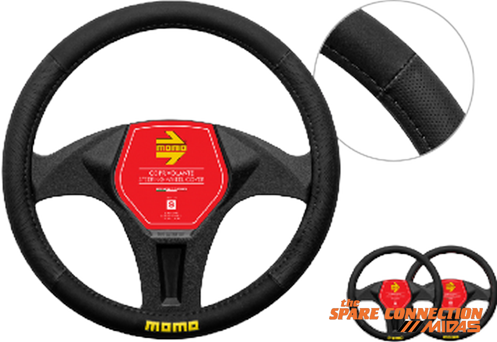 M SIZE (Ø 38~39 cm): SWC0EASBKS SIZE (Ø 36.5~37.9 cm): SWC0EASBKSBLACK-BLACK, YELLOW MOMO LOGO• SOFT SMOOTH AND PERFORATED BLACK PVC• BLACK STITCHING WITH YELLOW MOMO