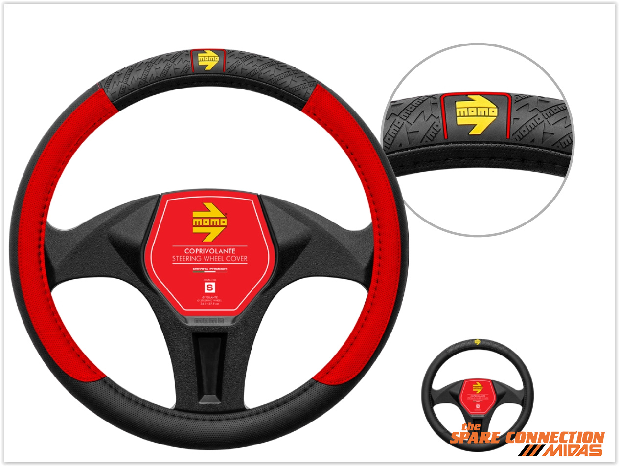 • PERFORATED BLACK/RED PVC• BLACK / RED STITCHING• BLACK TOP PVC GRIP INSERTS WITHYELLOW MOMO LOGO AND RED PROFILES