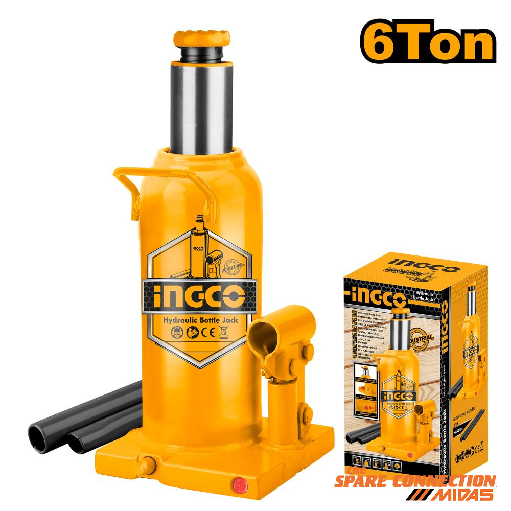 INGCO Hand Tools Hydraulic bottle jack 6Ton Max. height: 410mm Net weight:4.1kg 6Ton With safety valve Min. height: 210mm Max. height: 410mm Travel:200mmÂ