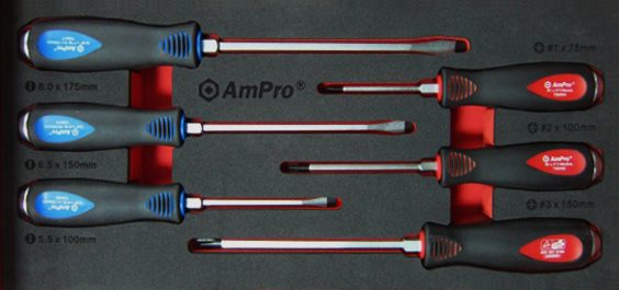 3 – Slotted Screwdrivers: 5.5 x 100mm, 6.5 x 150mm, 8 x 175mm3 – Phillips Screwdrivers: #1 x 75mm, #2 x 100mm, #3 x 150mm